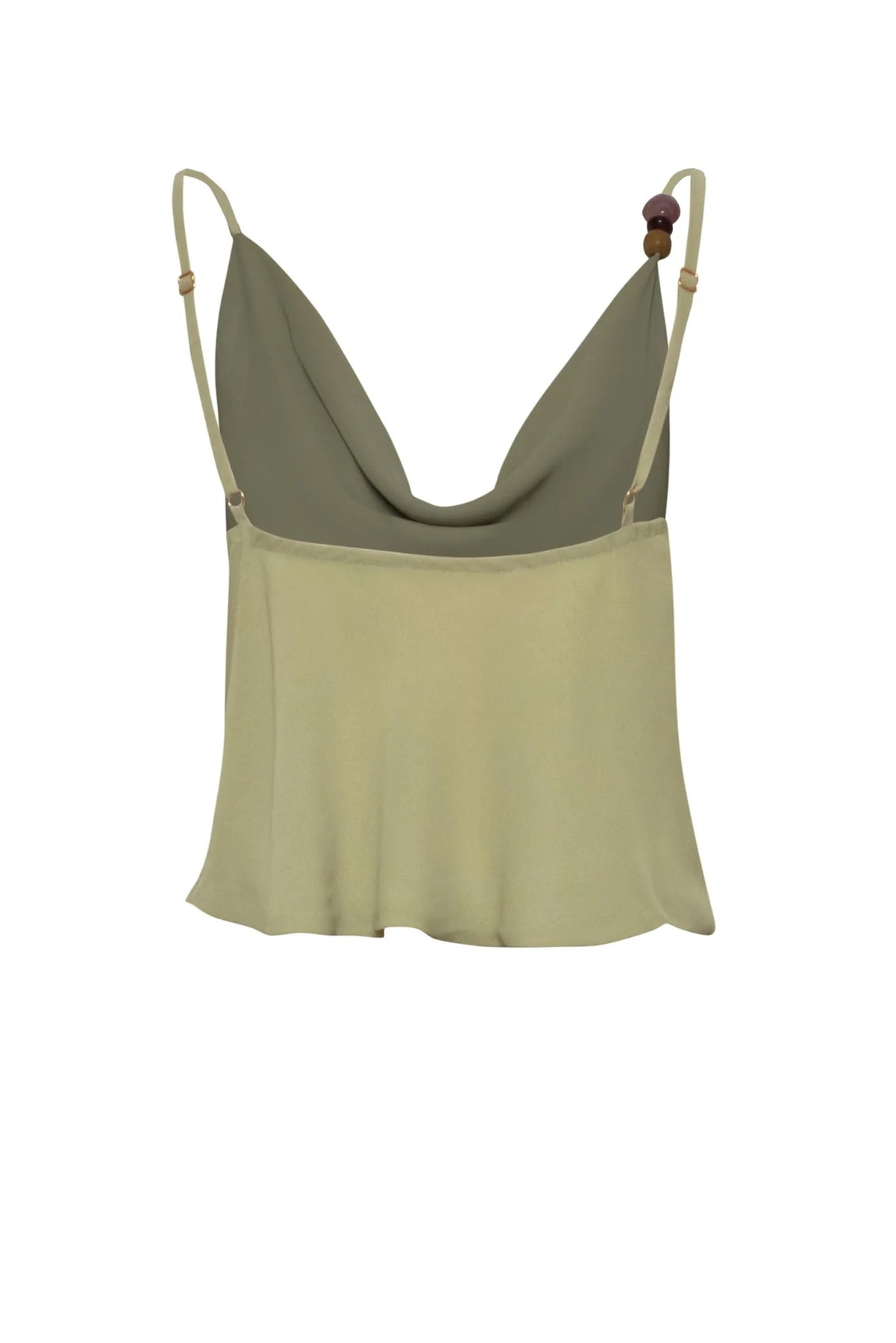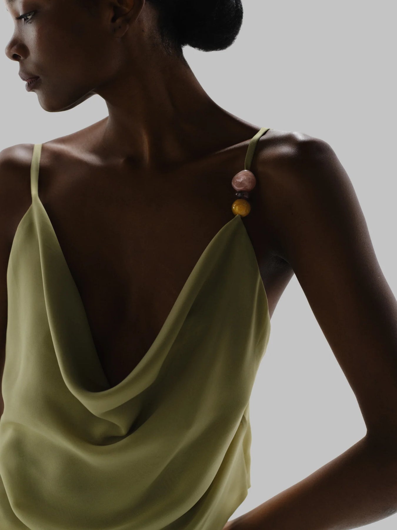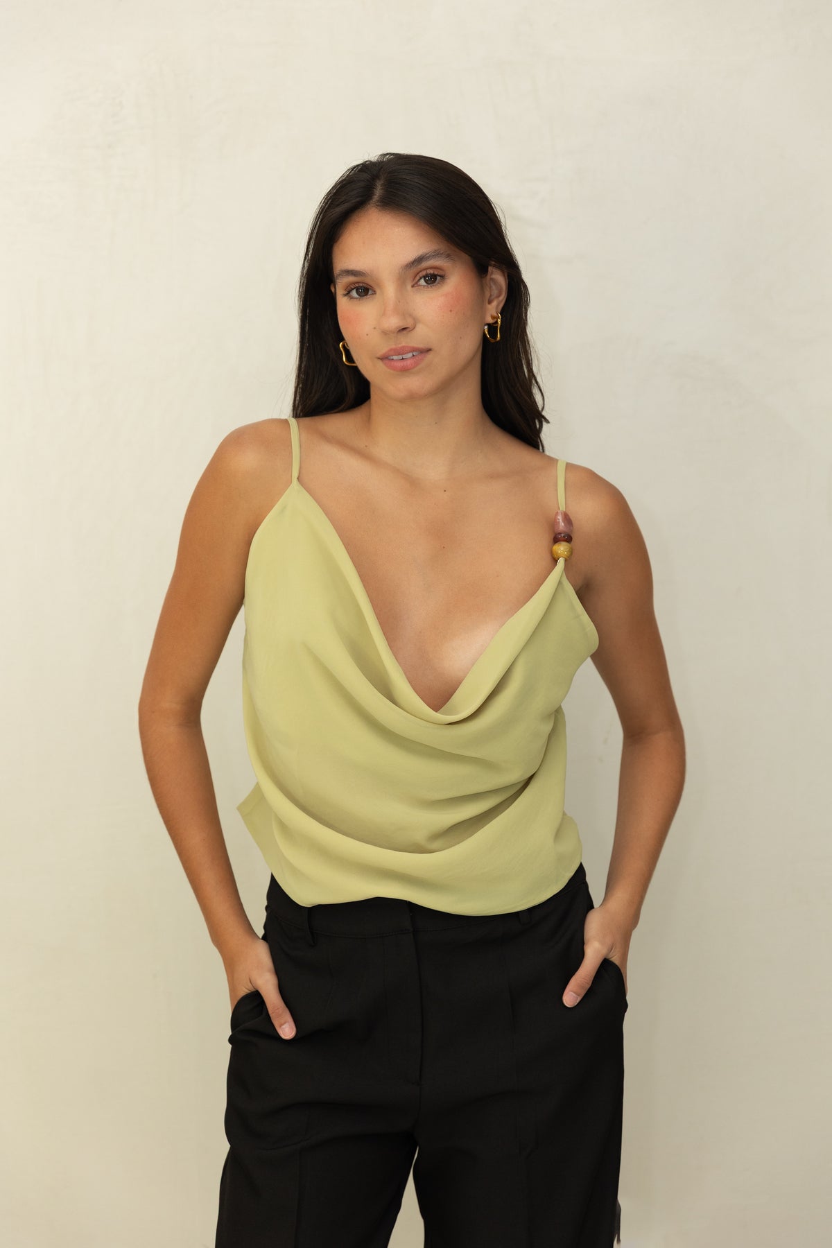 Introducing the “Carlota Top” in Jade Andino – a draped neckline silhouette designed to enhance the neckline with effortless elegance. Featuring adjustable straps, with resin stones embellishing one strap for a subtle touch of shine. Finished with a full lining for a smooth, refined feel.