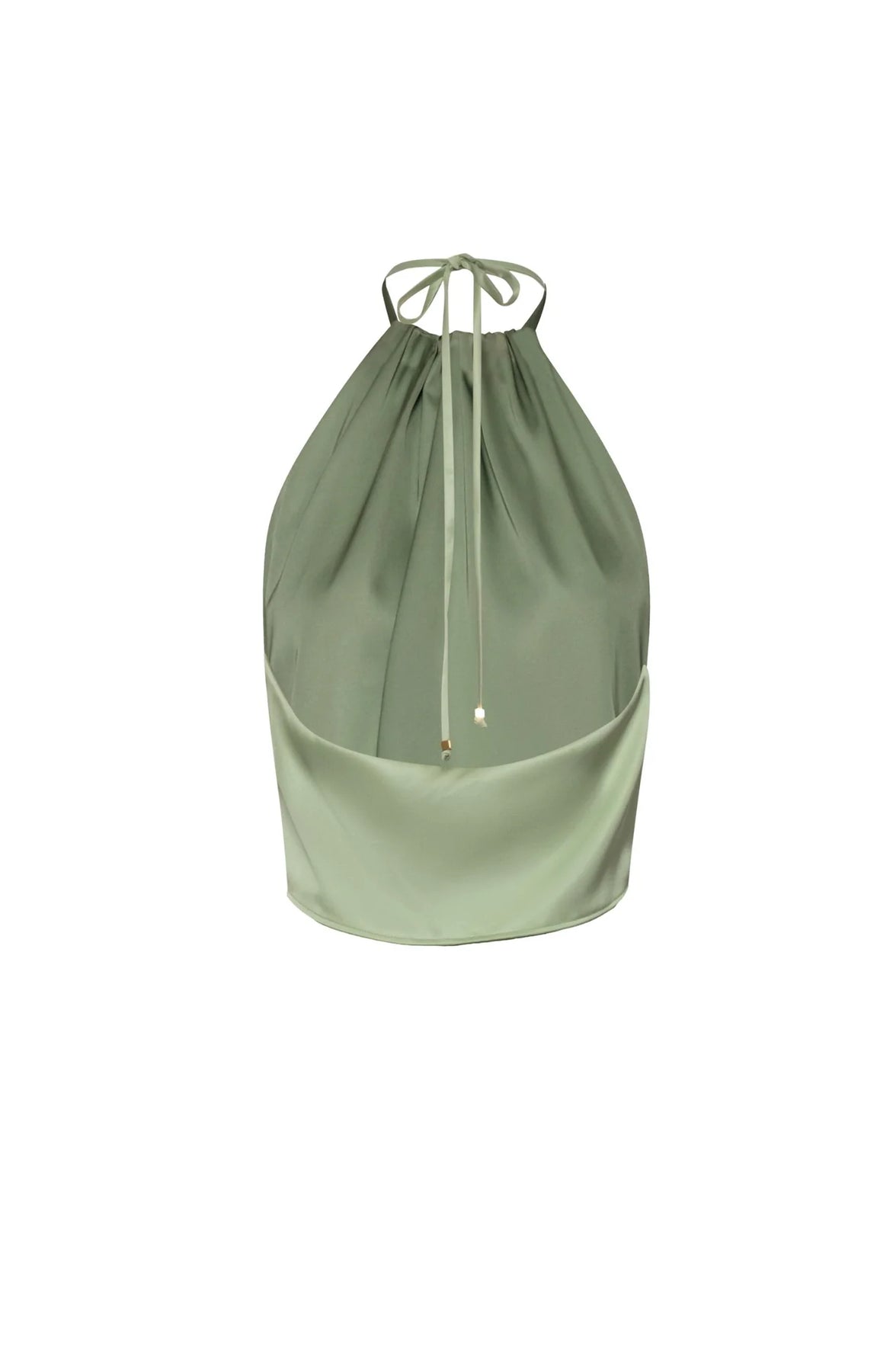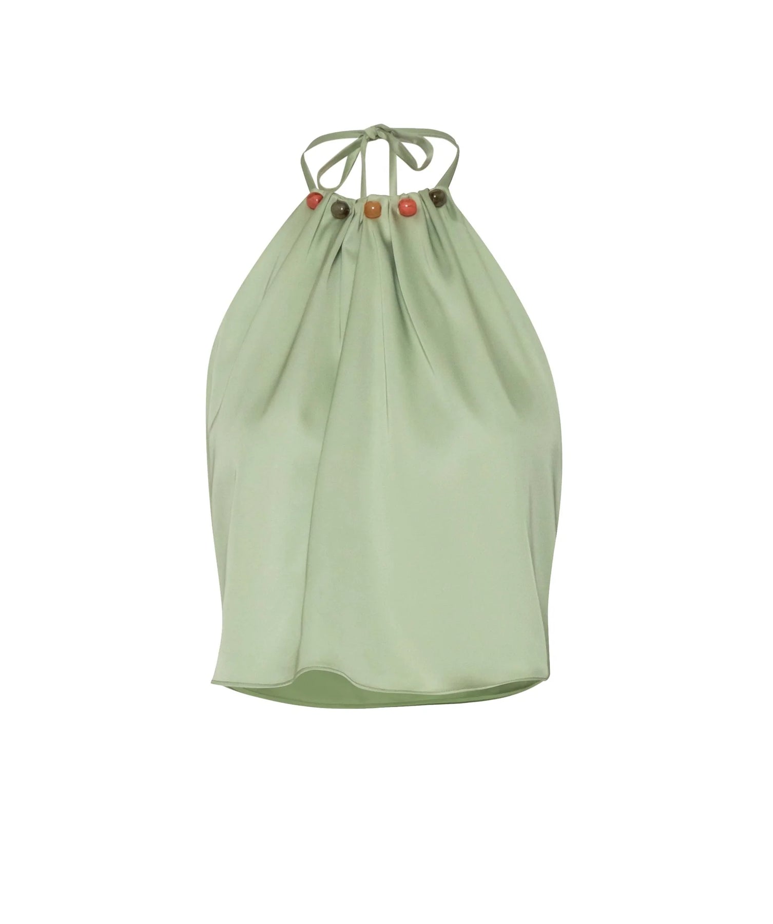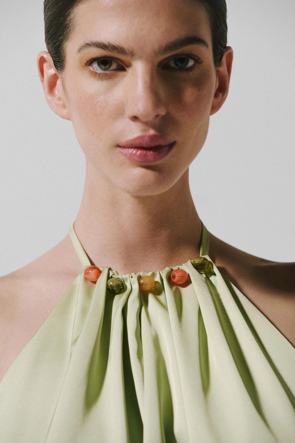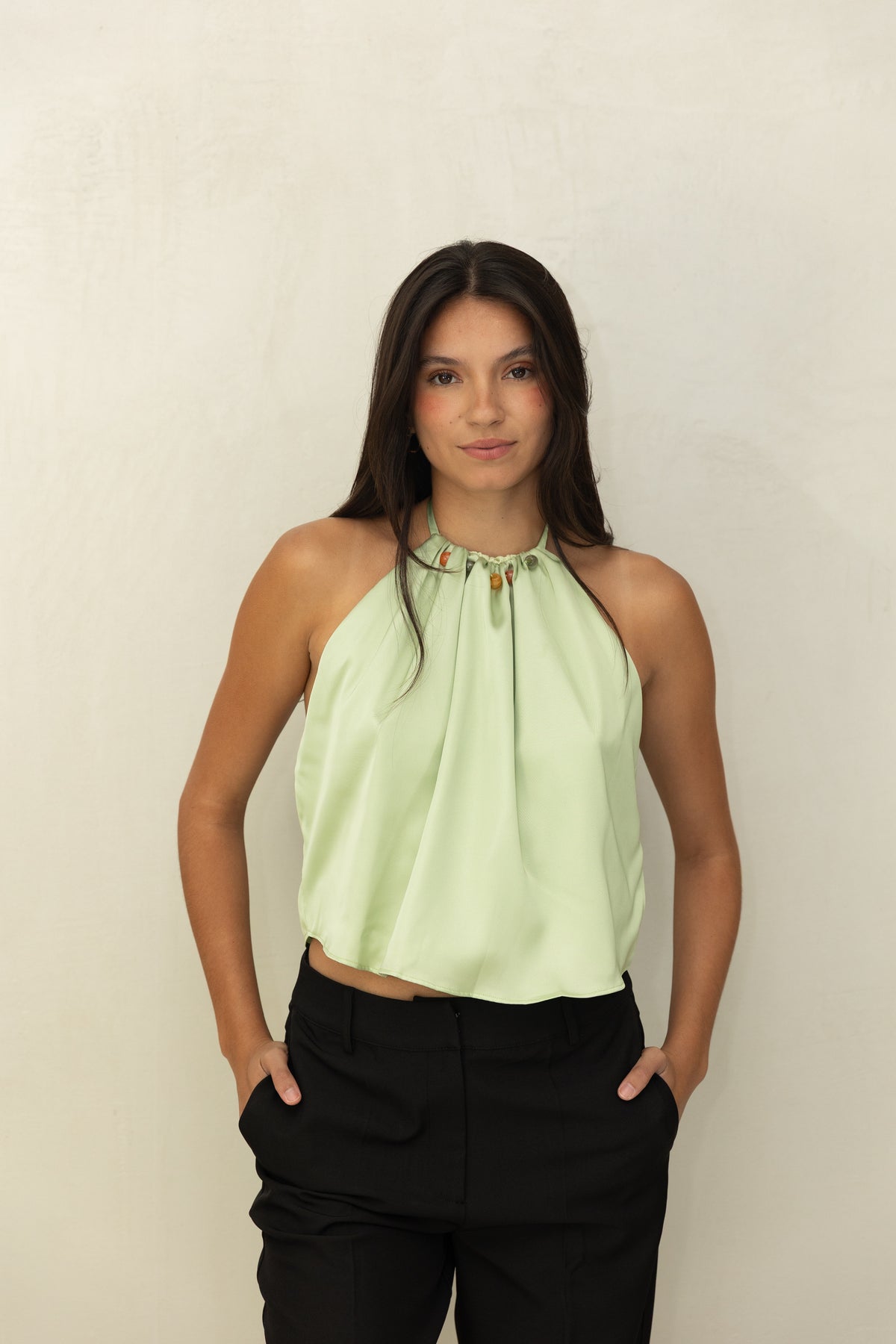Introducing the “Lorena Crop Top” in Lima Limon – a halter neckline design with an open back and self-tie straps for an adjustable fit. Embellished with resin stones and finished with a back zipper closure. Fully lined for comfort and support.